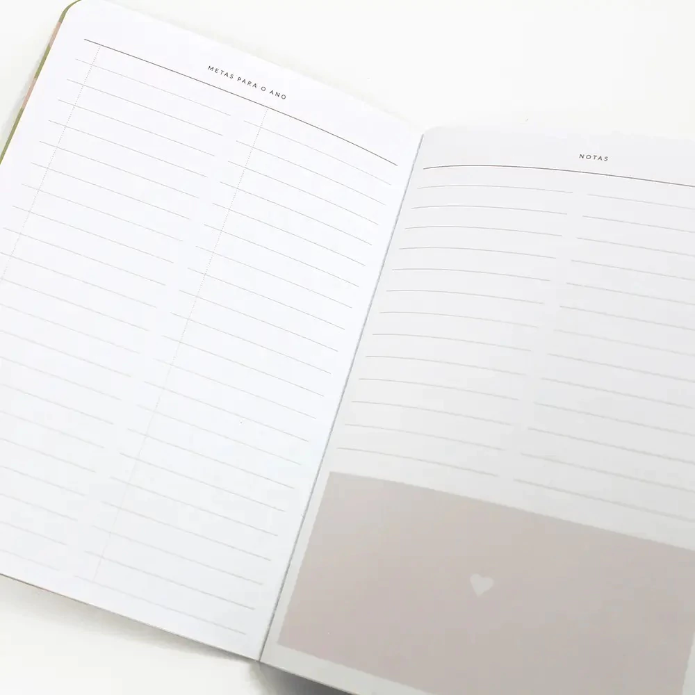 Possui área para planejamento mensal, metas para o ano, notas e área para 3 controles de hábitos.