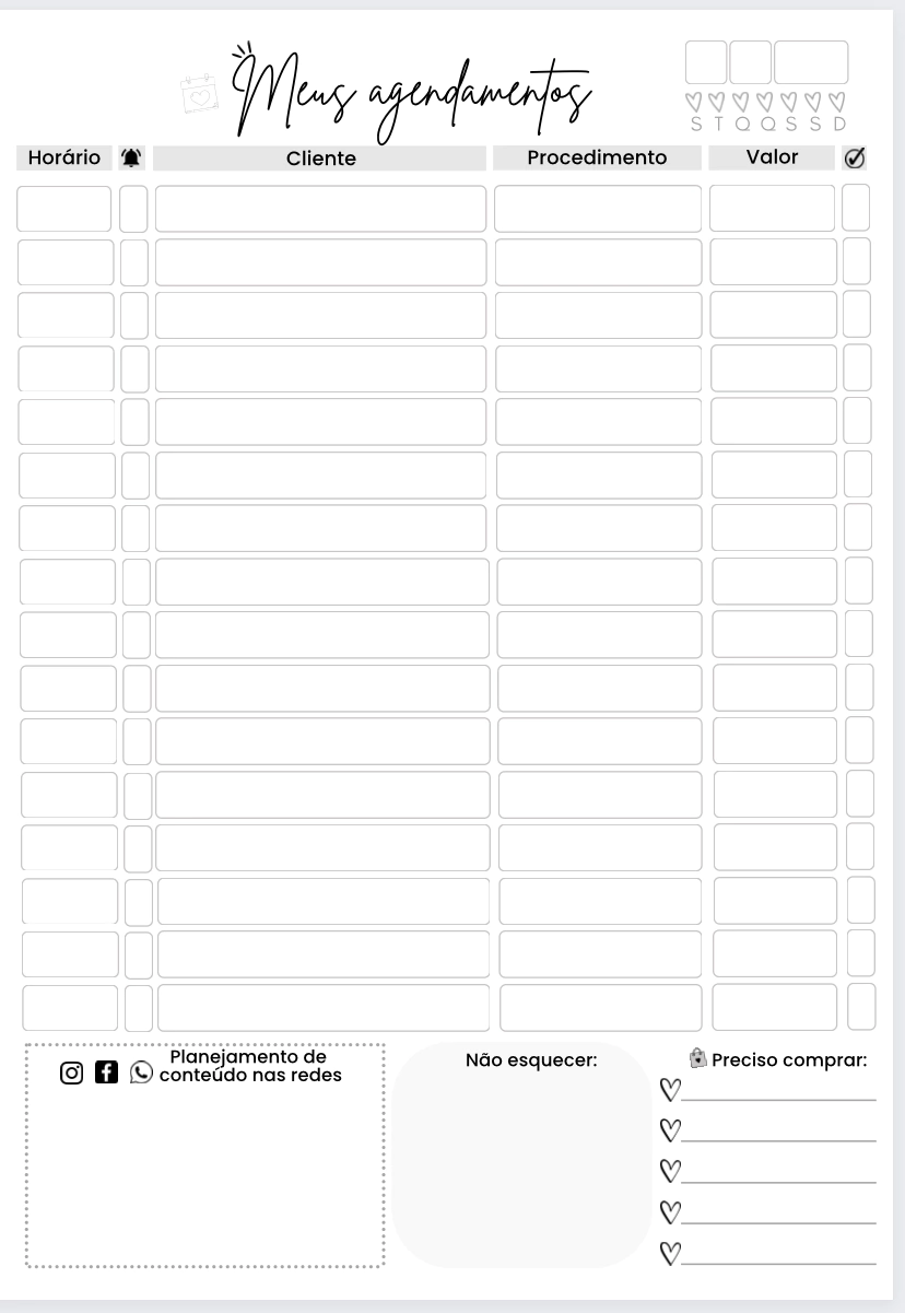 Organize-se de forma prática e eficiente com o nosso Módulo Agendamentos! Este planner foi especialmente desenvolvido para atender às necessidades de profissionais da área da saúde e estética que buscam otimizar seu tempo e gerenciar seus serviços com facilidade.