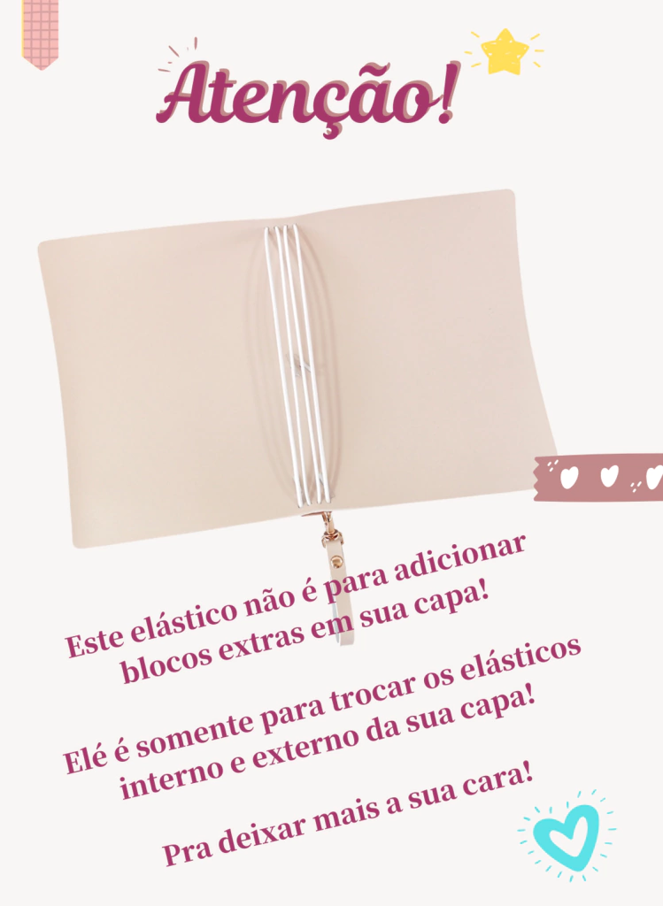 A capa do nosso planner já possui o elástico interno (para encaixe de 4 móulos) e externo (fechamento) conforme a foto no site, então NÃO é necessário adquirir mais um elástico.